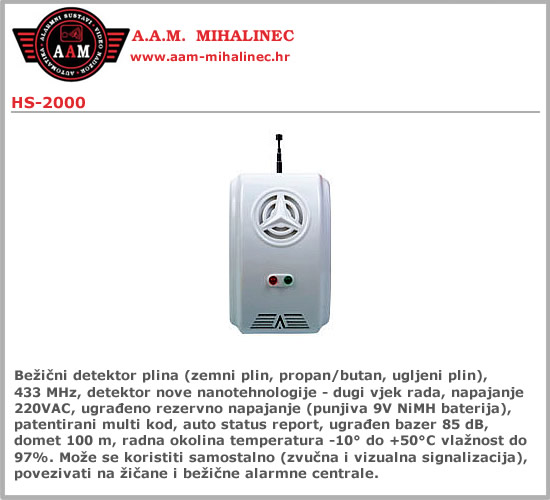 - Bežični detektor plina (zemni plin, propan/butan, ugljeni plin)